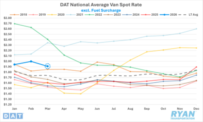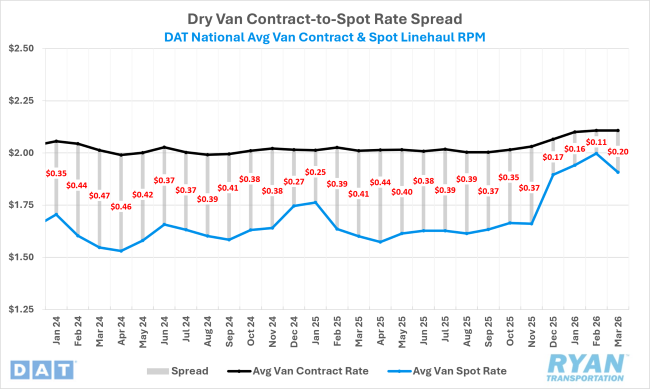 - Initially reported average dry van contract rates, excluding fuel, were unchanged in March but remained nearly 5% above March 2025 levels.