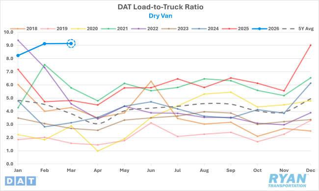 - The dry van load-to-truck ratio (LTR) remained essentially flat in March, increasing marginally from 9.13 in February to 9.14, but was approximately 90% higher YoY versus March 2025. According to DAT Freight & Analytics, both dry van load and truck postings strengthed 8.8% MoM during the month.