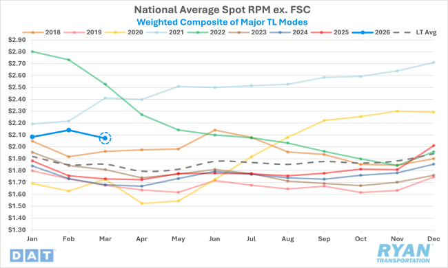 Typical seasonality patterns suggest a modest softening in overall truckload rates in April, followed by a rebound in May and continued firming through the summer months. Nonetheless, persistent capacity tightness combined with ongoing demand growth — particularly as produce and construction-related volumes begin to accelerate — should continue to allow carriers to pass through further increases in diesel prices and sustain upward pressure on both spot and contract pricing in the near term. However, the durability of the current rate environment over the mid- to long-term remains much less certain as prolonged periods of elevated rates generally incentivize capacity to re-enter the market, while a sustained, broad-based demand driver has yet to fully materialize.