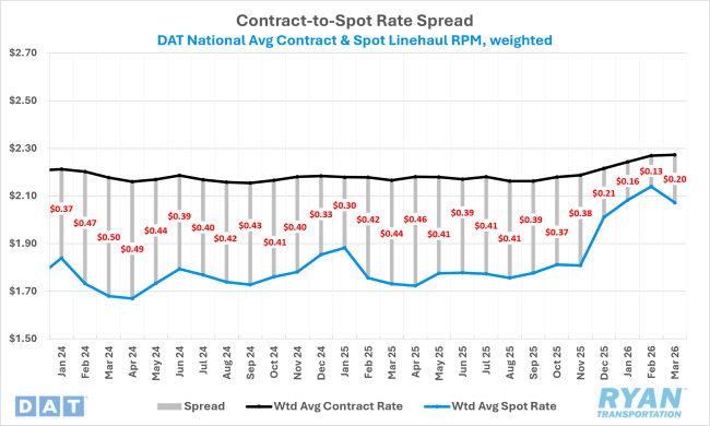 - After narrowing over the prior four months, stable contract pricing alongside softer spot linehaul rates widened the spread between the two markets, with contract rates trading at roughly a 10% premium to spot — up from a four‑year low of 6.1% in February.