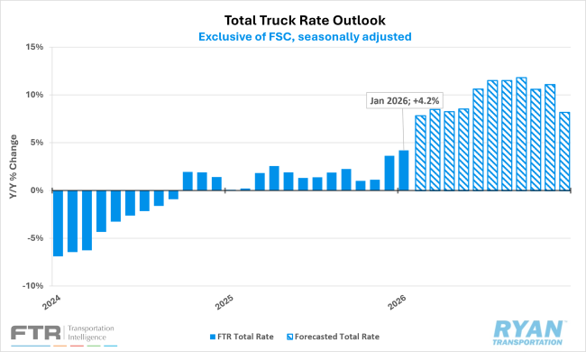 - FTR Transportation Intelligence revised its 2026 truckload rate forecast higher in its latest monthly market update, projecting total truckload rates to increase 9.4% YoY, excluding fuel, representing a 2.7 percentage point increase from the prior outlook of 6.7% growth.