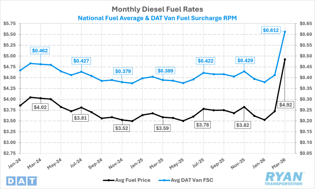 - According to the Energy Information Administration, the monthly average price of diesel increased by nearly $1.20/gal MoM in March — the largest monthly gain since reporting began in 1994 — lifting prices to approximately $1.34/gal above year-ago levels.