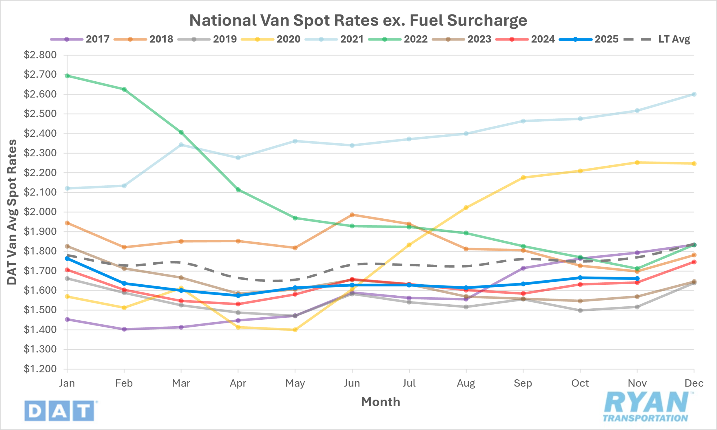 - Compared to November 2024, average dry van spot linehaul rates were up 1.2% YoY but were 6.1% below the LT average.