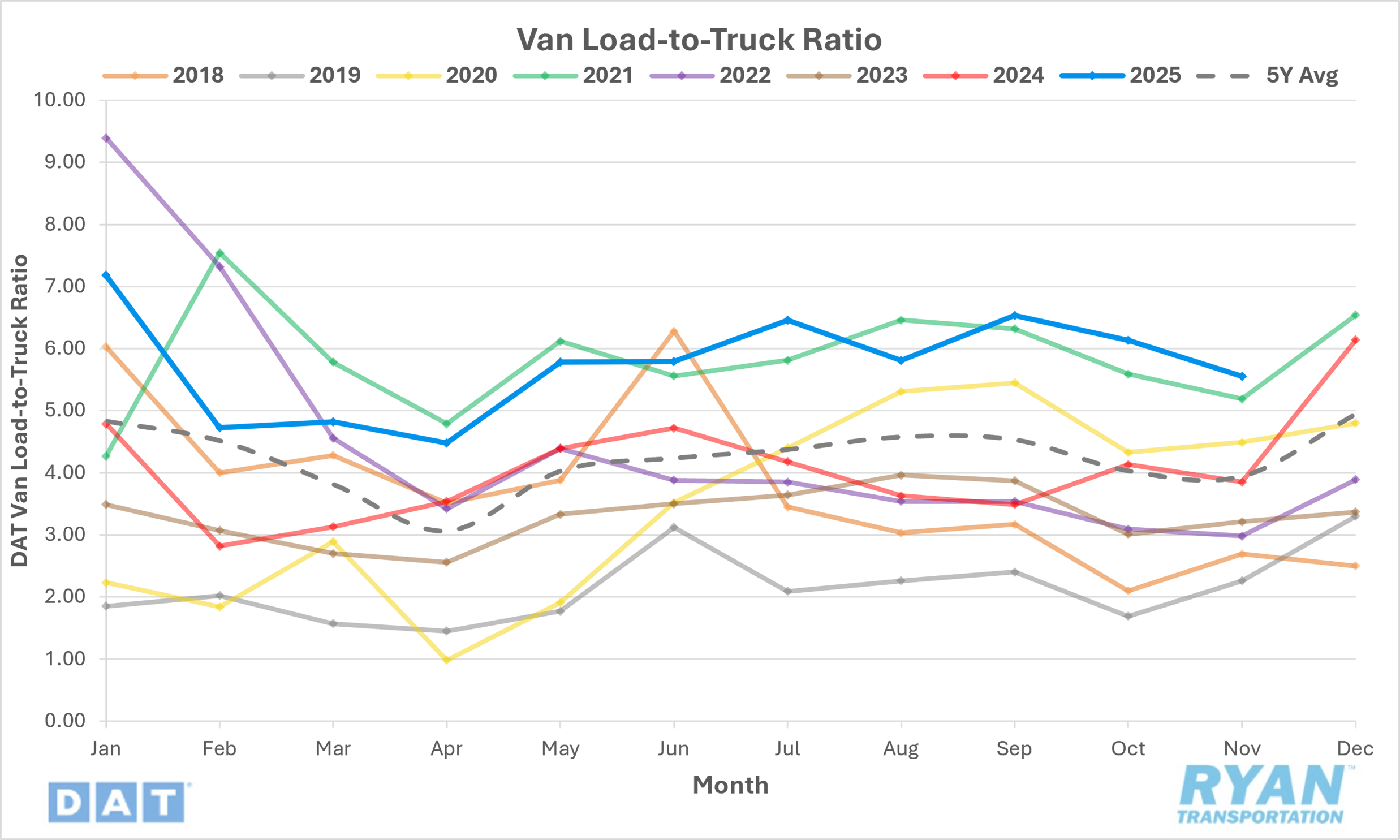 - The dry van load-to-truck ratio (LTR) declined 9.5% MoM in November, dropping from 6.13 in October to 5.55.