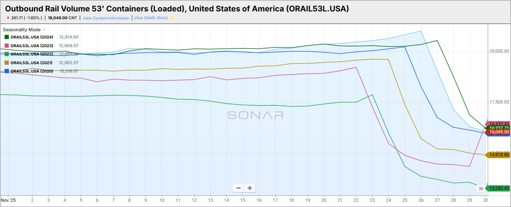 - Average loaded domestic rail volumes for 53’ containers in November were down 0.5% YoY compared to November 2024 and were 6.9% above the 5-year average.