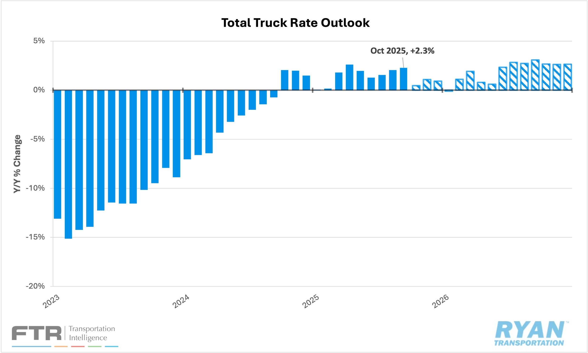In its latest forecast, FTR raised its total truckload rate outlook for both 2025 and 2026 by 10 basis points, with 2025 projected to rise +1.3% YoY (up from +1.2%) and the 2026 outlook increasing to +1.9% YoY (from +1.8%). The firmer guidance reflects stronger-than-expected spot rate performance in October. At the equipment level, however, the revisions were uneven: the refrigerated sector saw the most significant upward revision for 2026, rising from +2.6% to +3.2% YoY, while the dry van outlook remained unchanged and the flatbed forecast rose modestly from +1.5% to +1.7% YoY.