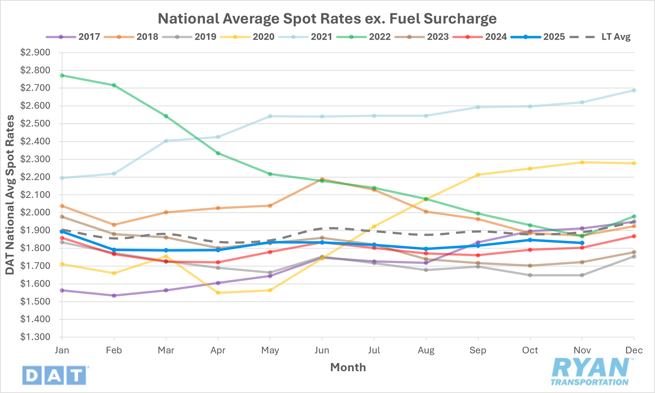 - Average linehaul rates were up 1.5% YoY compared to November 2024 and remained 3.3% below the long-term (LT) average.