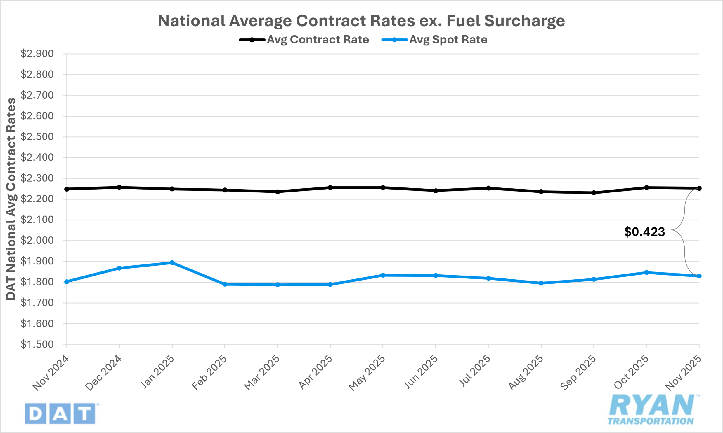 - The national average spot rate, excluding fuel, declined 0.9% MoM, or just under $0.02, to $1.83 in November.