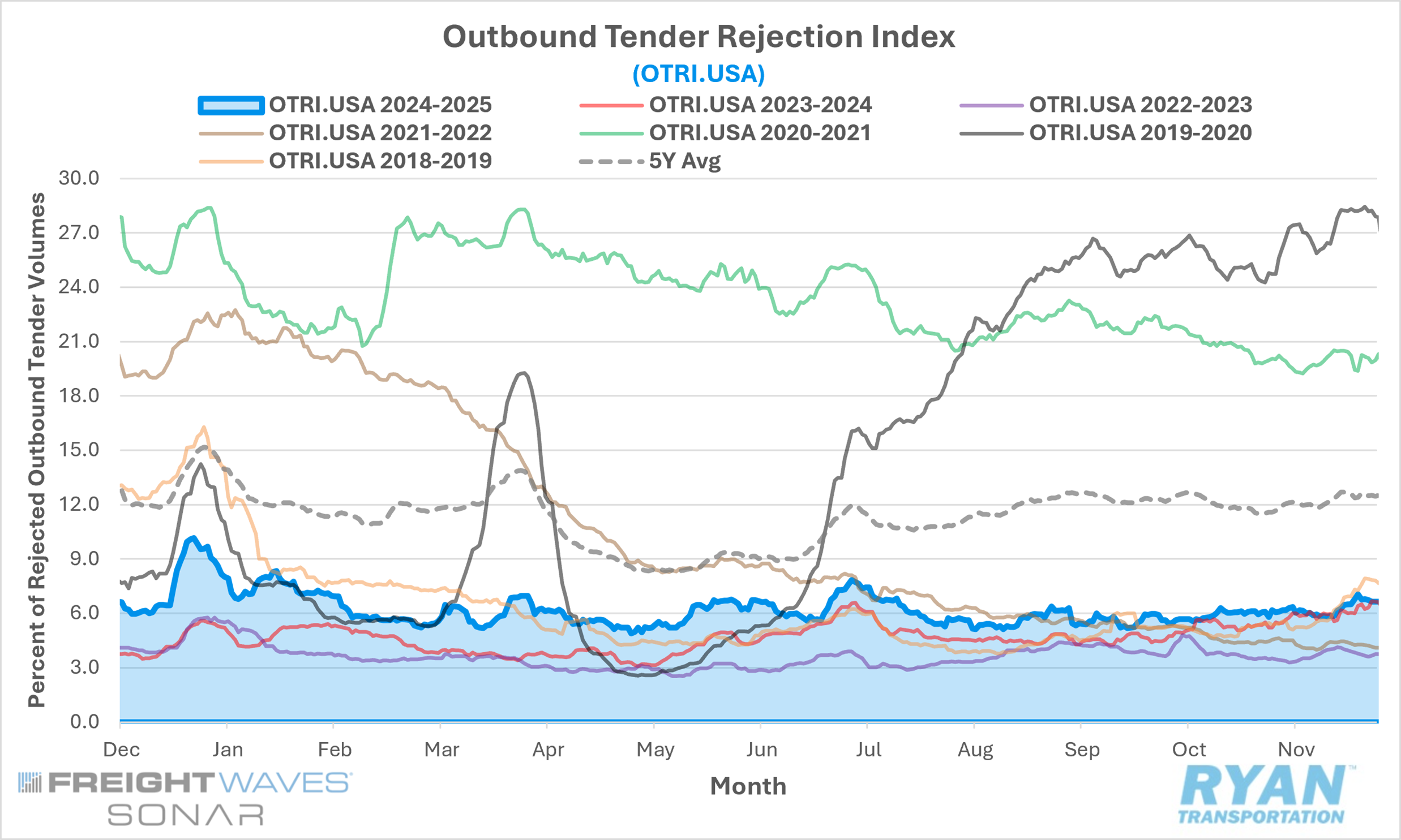 - Mid-month comparisons of the FreightWaves SONAR Outbound Tender Rejection Index (OTRI.USA), which measures relative capacity based on carriers’ willingness to accept freight volumes under contract, registered a 19 bps decline MoM in November, falling from 6.03% in October to 5.84%.