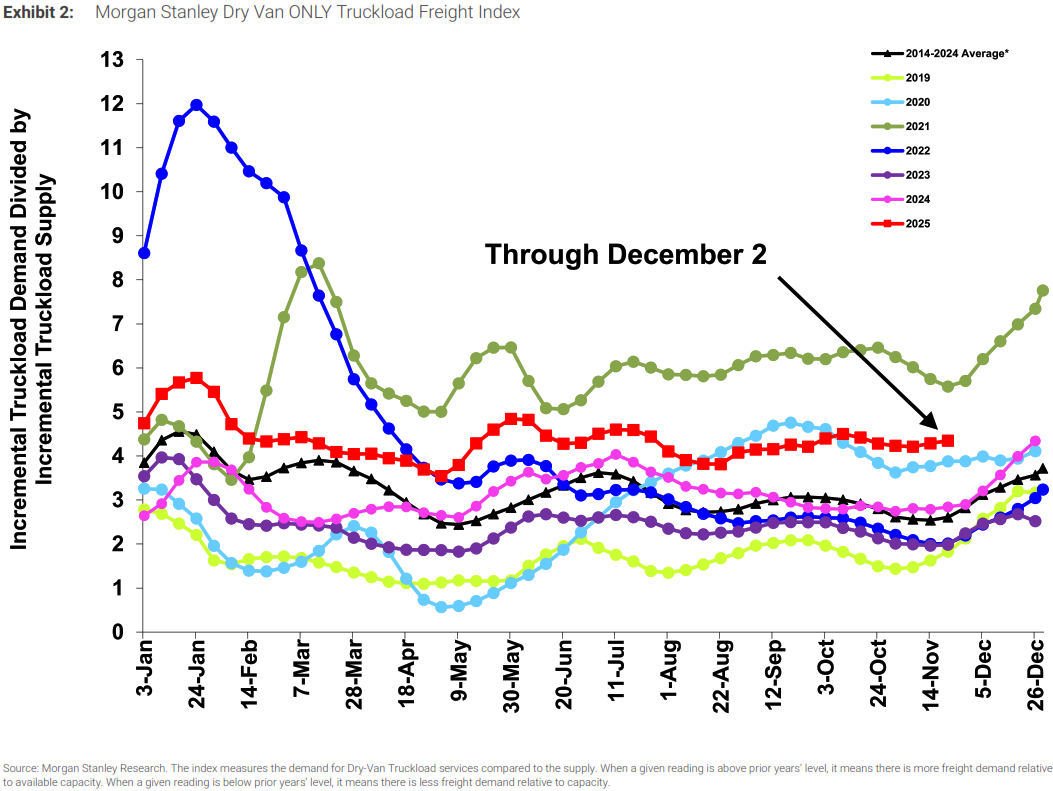 - Following sequential declines (directionally inline with seasonality) and a strong outperformance in early November, the Morgan Stanley Truckload Freight Index (MSTLFI) flipped in the back half of November, increasing sequentially but underperforming typical seasonality driven by both supply and demand.