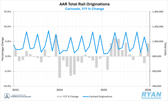 - Total U.S. rail carload volumes increased 4.4% YoY in January 2026, ending a three-month streak of declines. The gain was driven by expansion in 12 of the 20 major AAR-tracked commodity categories — most notably grain, coal and industrial products — which more than offset a pronounced contraction in automotive shipments.