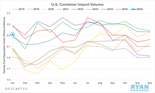 - Spot volumes continued to surge in January, driven by capacity disruptions from the holidays early in the month and Winter Storm Fern late in the month.