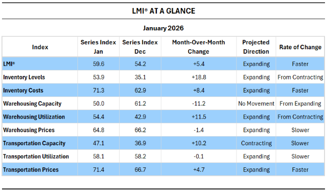 - The January Logistics Managers’ Index (LMI®) recorded its fastest rate of expansion since May of last year, driven primarily by a resumption of modest restocking activity at the start of the year. According to the report, both Inventory Levels and Warehouse Utilization returned to expansion after sharp contractions in December. However, they remain slightly below historical norms for January as firms continue to prioritize lean inventories amid demand uncertainty and elevated cost pressures.