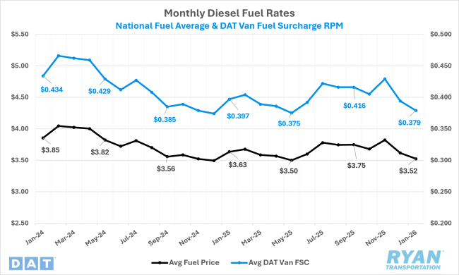 - Average fuel prices declined for a second consecutive month in January, falling $0.09 from December’s average and running $0.11 lower YoY compared to January 2025, according to the U.S. Energy Information Administration (EIA). In its latest Short-Term Energy Outlook, the EIA revised its 2026 diesel price forecast lower, now projecting a 10.7% YoY decline, down from its prior estimate of an 8.2% decrease.