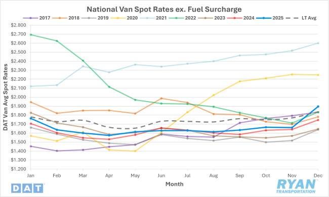 - Average dry van linehaul spot rates surged by nearly $0.24 MoM in December, reaching their highest level in more than two and a half years and standing 8.6% above December 2024 levels, as well as 3.1% above the long-term average.