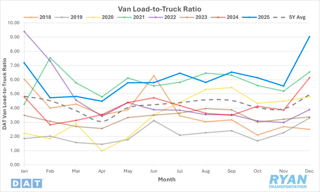 - The dry van load-to-truck ratio surged to 9.02 in December, marking its second-highest level of the past decade. This reading trails only the 9.39 recorded in January 2022 at the peak of the current truckload cycle.