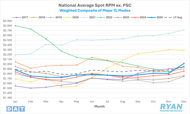 - Average linehaul spot rates surged nearly $0.21 MoM in December, driven largely by sharp gains early in the month. The 11.4% MoM increase pushed spot rates to their strongest YoY position since February 2022, with rates averaging $0.16 higher than December 2024 levels. As a result of the December rally, average spot linehaul rates moved 3.8% above the long-term average for the first time since May 2023.