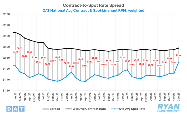 - Average contract rates increased by just under $0.04 MoM in December, bringing average contract pricing in line with December 2024 levels. Despite the improvement, the outsized strength in spot rates materially compressed the contract-to-spot spread, which narrowed to approximately $0.27 after remaining within a $0.35 to $0.45 range for most of the year.