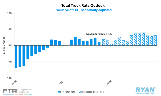 - In its latest outlook, FTR revised its 2026 total truckload rate forecast upward by 60 basis points, increasing projected growth from +1.9% YoY to +2.5%. The upward revision was driven primarily by a stronger outlook for spot rates, which were revised higher from +2.5% YoY to +3.6%. According to FTR, the improvement in spot market expectations also supported a modest upward revision to contract rates, with forecast growth increasing from +1.7% YoY to +2.0%. By equipment type, refrigerated rates are expected to lead in 2026 with total rate growth of +3.9% YoY, followed by dry van rates at +2.3% YoY and flatbed rates at +2.1% YoY.