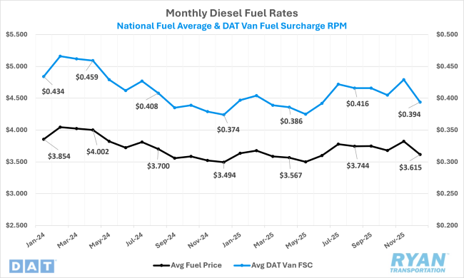 - Average fuel prices exhibited heightened volatility in the final two months of the year after remaining relatively stable for much of 2025. According to the U.S. Energy Information Administration (EIA), the national average retail diesel price declined by approximately $0.21 per gallon in December following a $0.14 per gallon increase in November. Looking ahead to 2026, the EIA expects rising global oil inventories to exert downward pressure on petroleum prices, forecasting an 8% YoY decline in average diesel prices.