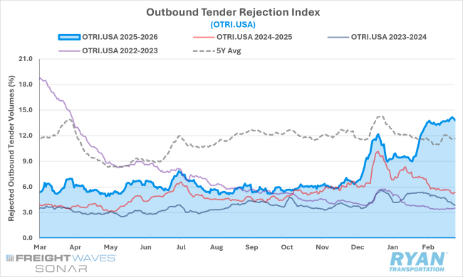 Tender rejection rates remained elevated throughout February following the late-January surge triggered by Winter Storm Fern and subsequent storms along the East Coast, which pushed rejection levels above 13% and to their highest point since early 2022.