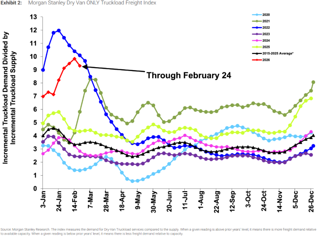 - The pronounced outperformance relative to seasonal expectations recorded by the Morgan Stanley Truckload Index (MSTLFI) in late January persisted into early February, driven by robust performance across both supply and demand components during the first half of the month.