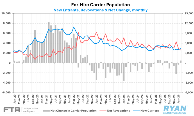 - The for-hire carrier population increased for the first time in four months during February, registering a net addition of 474 carriers — the largest monthly increase since May. According to FTR's preliminary analysis of FMCSA data, net revocations (revocations less reinstatements) declined to 3,899 carriers in February, representing a reduction of 484 carriers and marking the lowest monthly figure since October 2021.