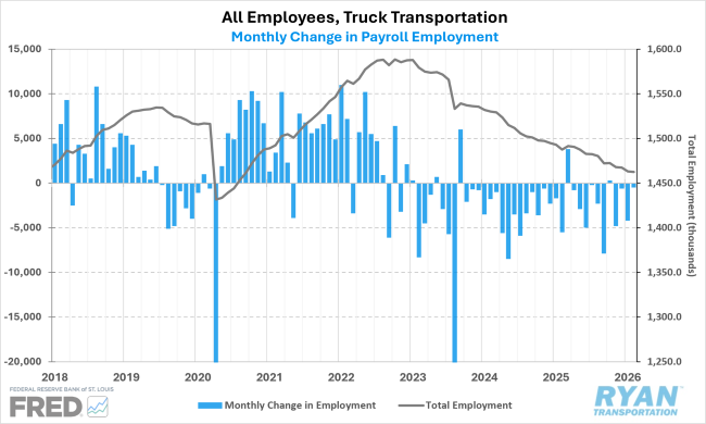 - Seasonally adjusted truck transportation payroll employment declined by 500 jobs in February, according to the Bureau of Labor Statistics. The decline followed slight upward revisions to December and January estimates totaling a net increase of 700 jobs, though January’s sharp drop from December remained largely unchanged. Despite the slower pace of contraction, employment in the sector is still down 4,700 jobs since December and 25,100 jobs from a year ago, reaching its lowest level since September 2020.