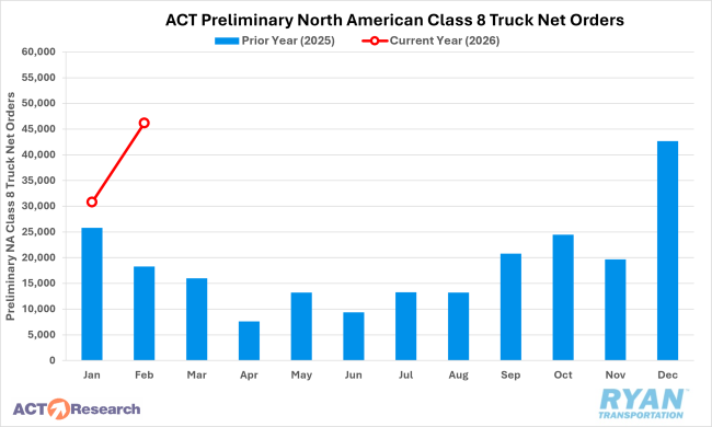 - Preliminary North American Class 8 truck orders surged in February, a sign that carriers may be anticipating further improvements in freight fundamentals.