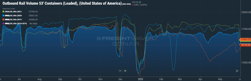 - Total loaded volumes for 53’ containers from all domestic markets measured by FreightWaves SONAR Loaded Outbound Rail Volume Index (ORAIL53L.USA) remained relatively flat through most of May, increasing just over 1.0% in the week leading up to Memorial Day before dropping 11.3% after the holiday, and in line with seasonal expectations.