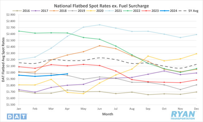- The national average flatbed spot rate excluding fuel increased 1.2% MoM, or $0.04, in April to $1.98.