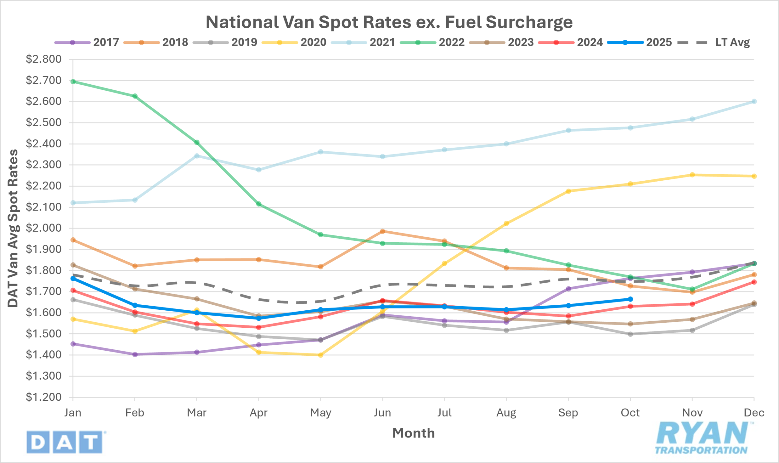 - Compared to October 2024, average dry van spot linehaul rates were up 2.1% YoY but were 5.1% below the LT average.
