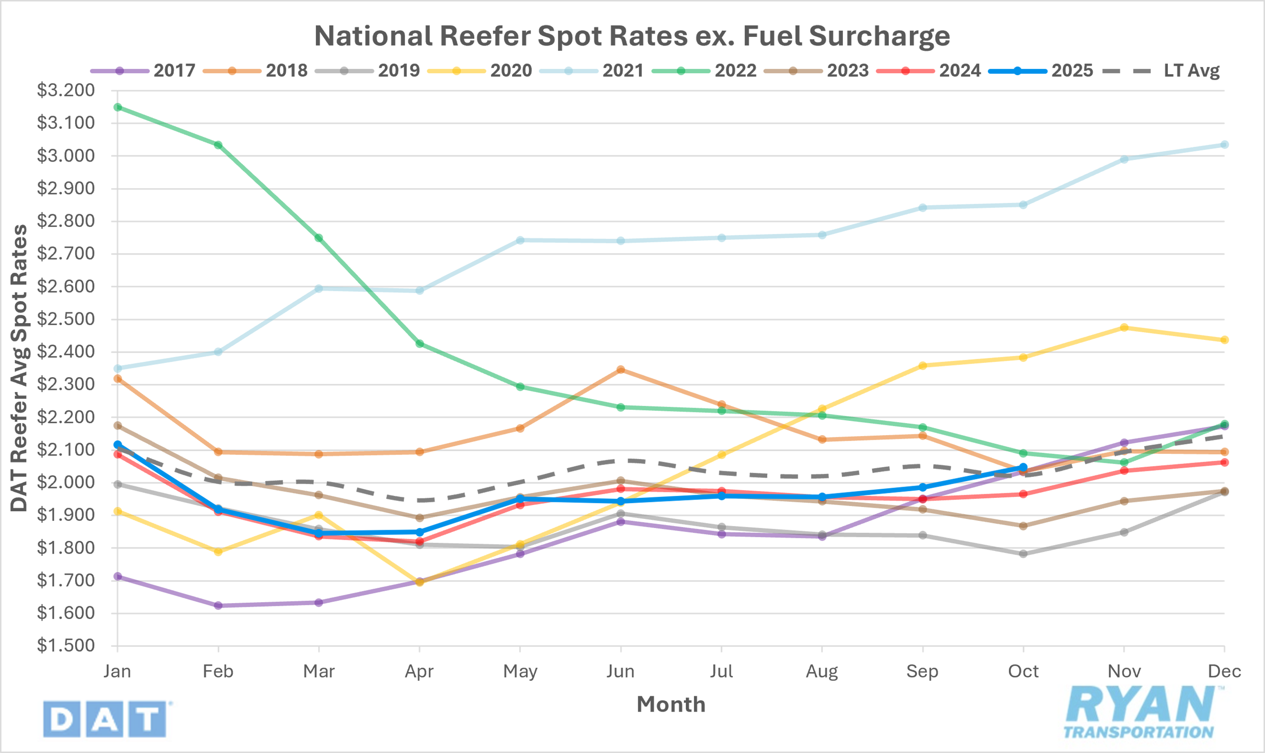 - Compared to October 2024, the reefer LTR was 93.0% higher YoY and was 54.0% above the 5-year average.