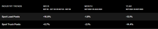 Despite this relative stability, freight volumes in September continued to flow primarily through the contract market, as spot market activity registered declines. According to DAT, spot market volumes jumped 11.5% WoW leading up to Labor Day, but then steadily decreased through the first two weeks of September. However, spot activity recovered in the last two weeks of the month ahead of Hurricane Helene and anticipated port strikes, with volumes rising by just over 10% and 13% WoW, respectively, by month-end.
